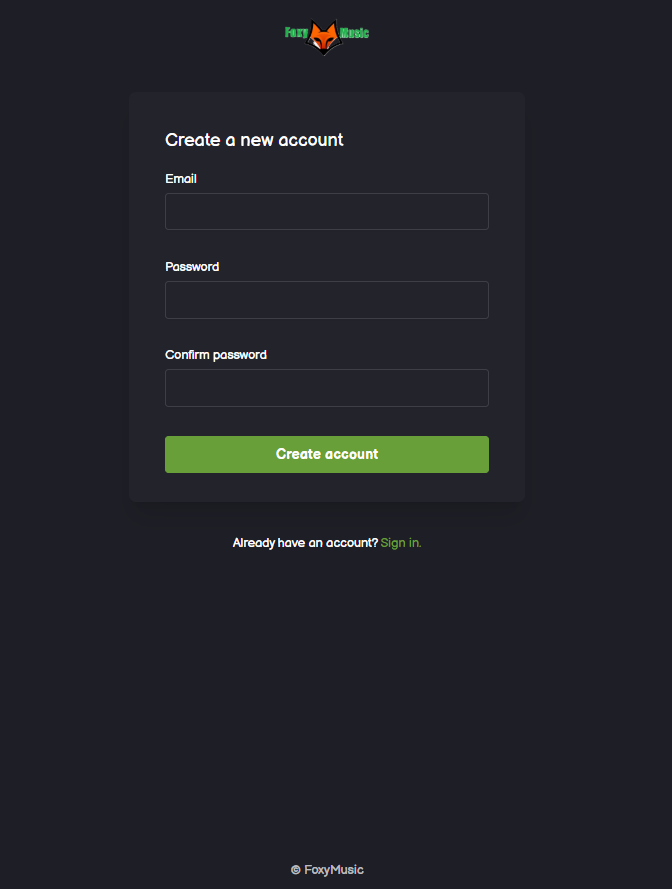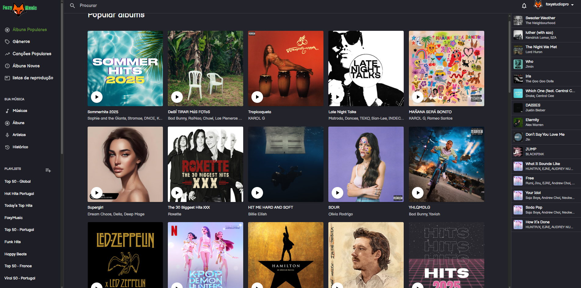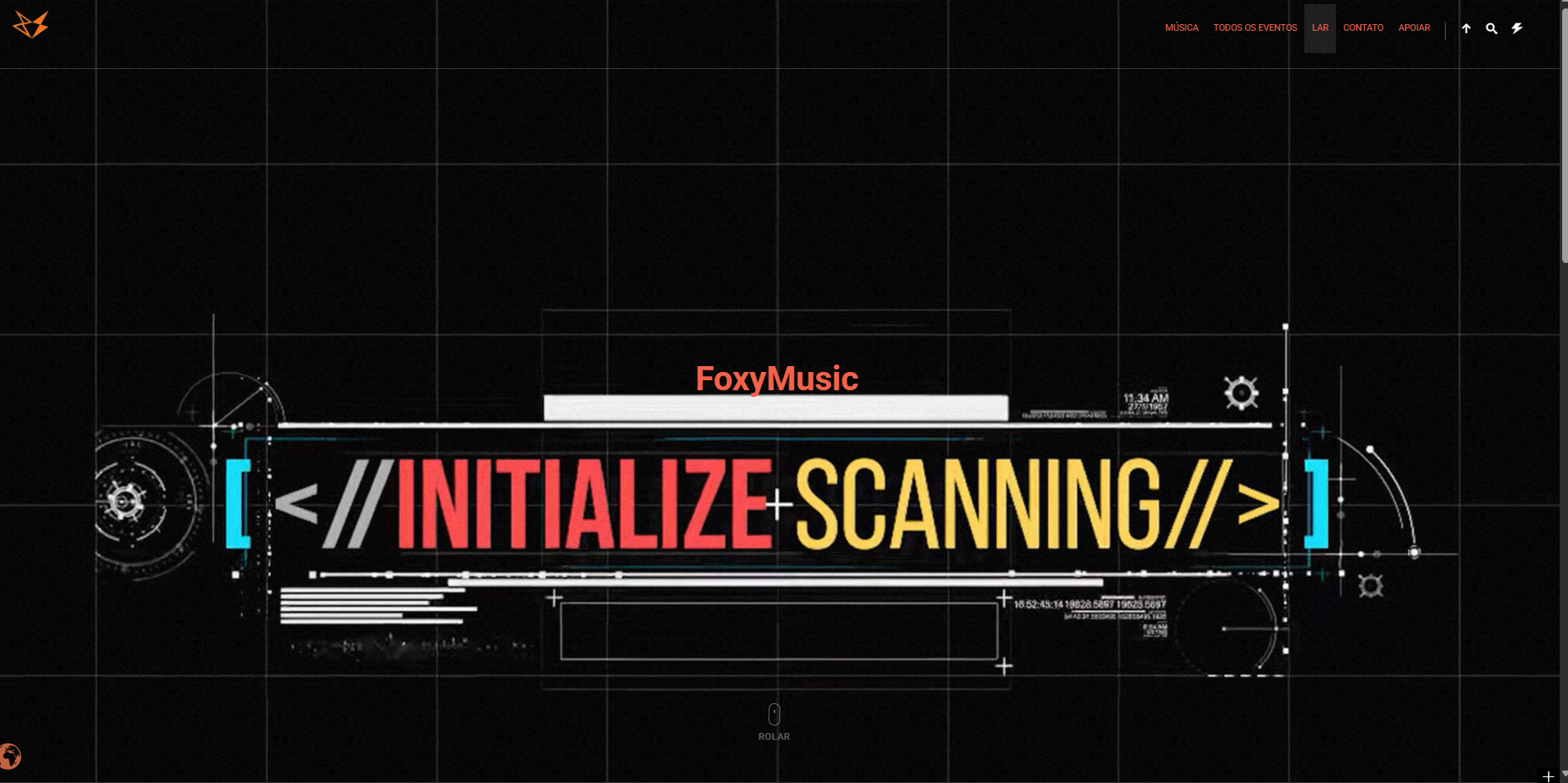 A FoxyMusic está dividida em três partes. Uma, a Página Inicial, ou a nossa “Landing Page”, onde os visitantes são recebidos, com uma breve descrição do site e suas funcionalidades. Ao entrar, é reproduzido um vídeo de boas-vindas, pode desligar o som na parte inferior direita, no ícone que apresenta ser um símbolo de somar. Ao clicar, abre o Player do site.