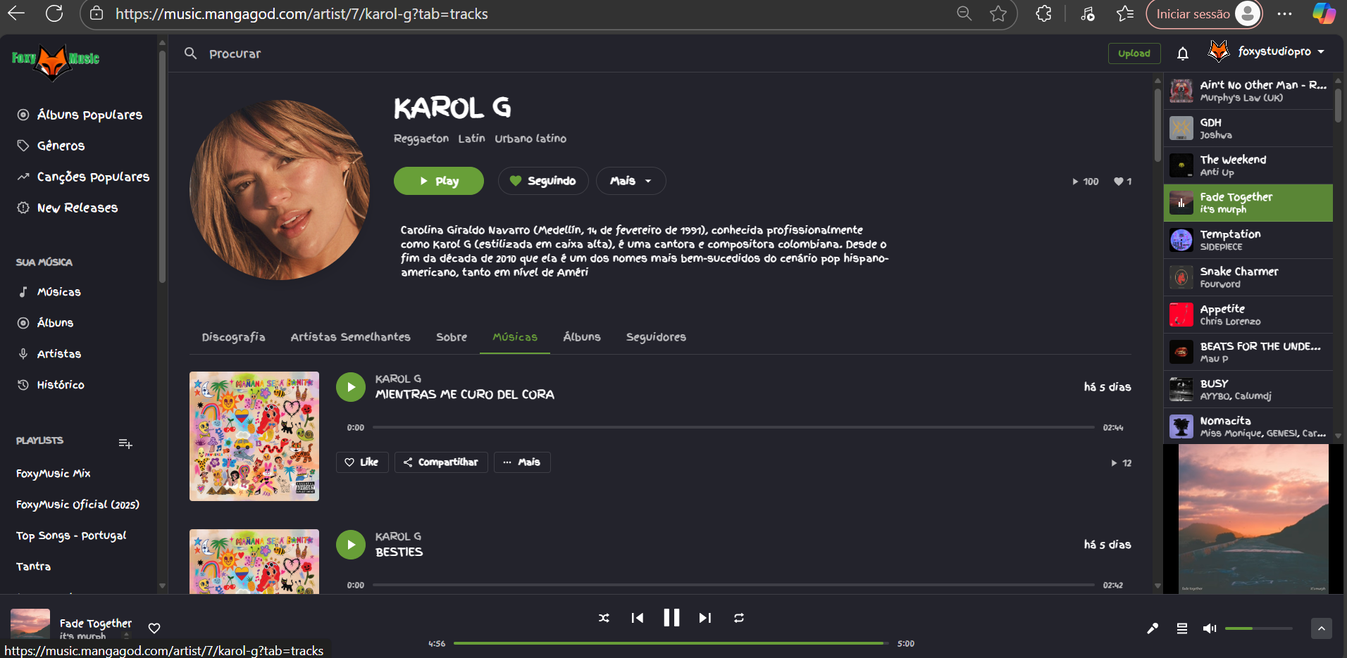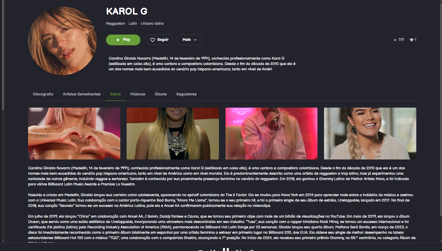 Na Página do Artista, encontra diversa informação relativa ao artista em questão. Aqui pode ver toda a discografia existente, todos os álbuns, ver outros artistas semelhantes e podes seguir o artista.