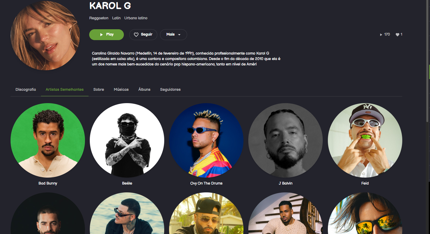 Ao selecionar "Artistas Semelhantes" abre um nova página com outros artistas semelhantes ao selecionado.