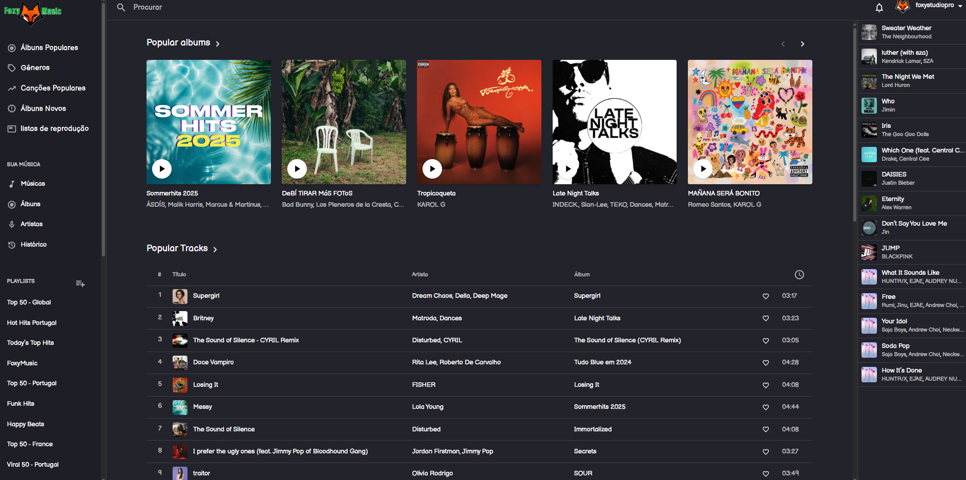 Na página principal, vai poder ver os álbuns mais populares (mais ouvidos) e as faixas mais populares da FoxyMusic.